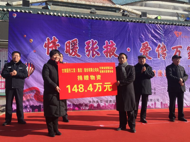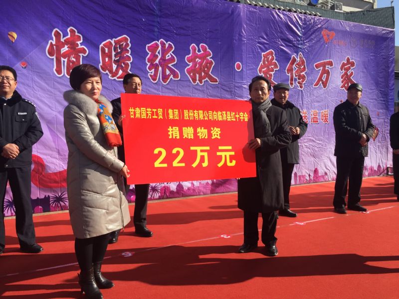 2019年1月11日,甘肅省慈善總會、張掖市慈善協(xié)會、甘州區(qū)慈善協(xié)會以及臨澤縣紅十字會攜甘肅國芳工貿(mào)(集團(tuán))股份有限公司在張掖市中心廣場共同舉行“情暖張掖·愛傳萬家”送健康送溫暖活動,將2000套棉衣,2000余套秋衣秋褲,27臺彩電以及300余件小家電合計(jì)價(jià)值148萬元的過冬物資帶給山丹縣,民樂縣的困難群眾,將2500個(gè)醫(yī)藥箱帶給臨澤縣的老人們。此次活動傳導(dǎo)社會幫扶、精準(zhǔn)扶貧精神的同時(shí)也默默為社會傳導(dǎo)著一份正能量。