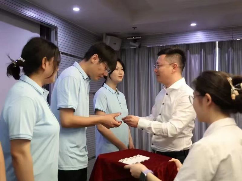 伴隨著激昂的音樂,入職儀式進入了發(fā)放工牌的環(huán)節(jié)。國芳集團各位領(lǐng)導面帶微笑,將蘊含著公司信任與期望的工牌并伴手禮交到新員工手上,工牌在燈光的照耀下,折射出他們堅定的信念和對新征程的信心。