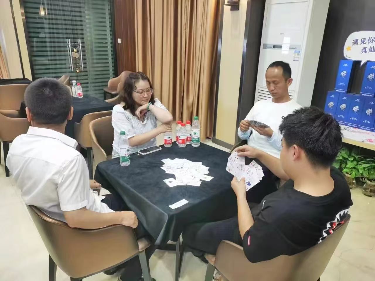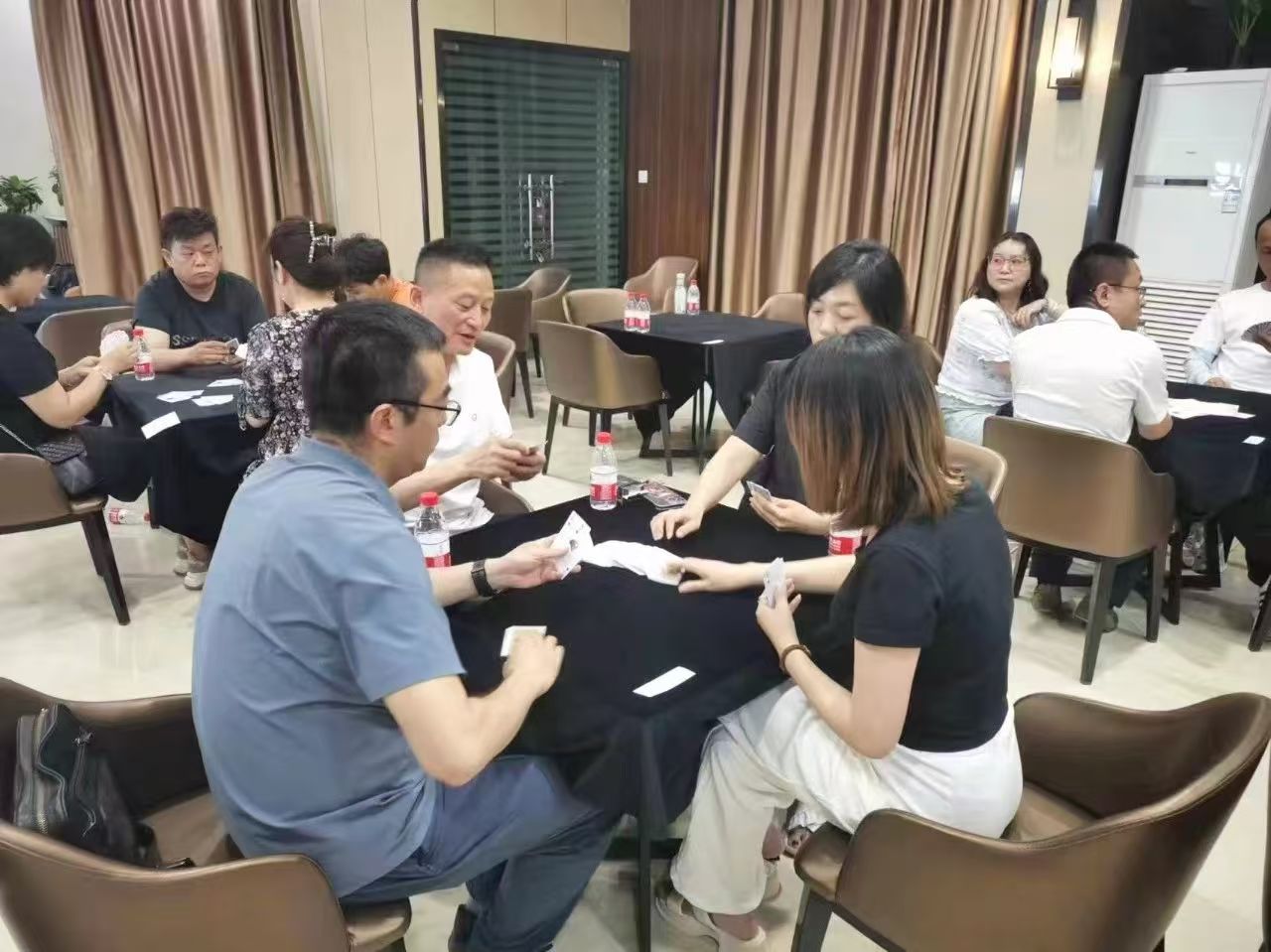 在運動會的摜蛋比賽現(xiàn)場,氣氛熱烈而又緊張。一張張牌桌整齊排列,參賽選手們兩兩相對而坐,神情專注而投入。他們的目光緊緊鎖住手中的牌,大腦飛速運轉(zhuǎn),思考著出牌策略。每一次出牌都顯得深思熟慮,又充滿了果斷和自信。